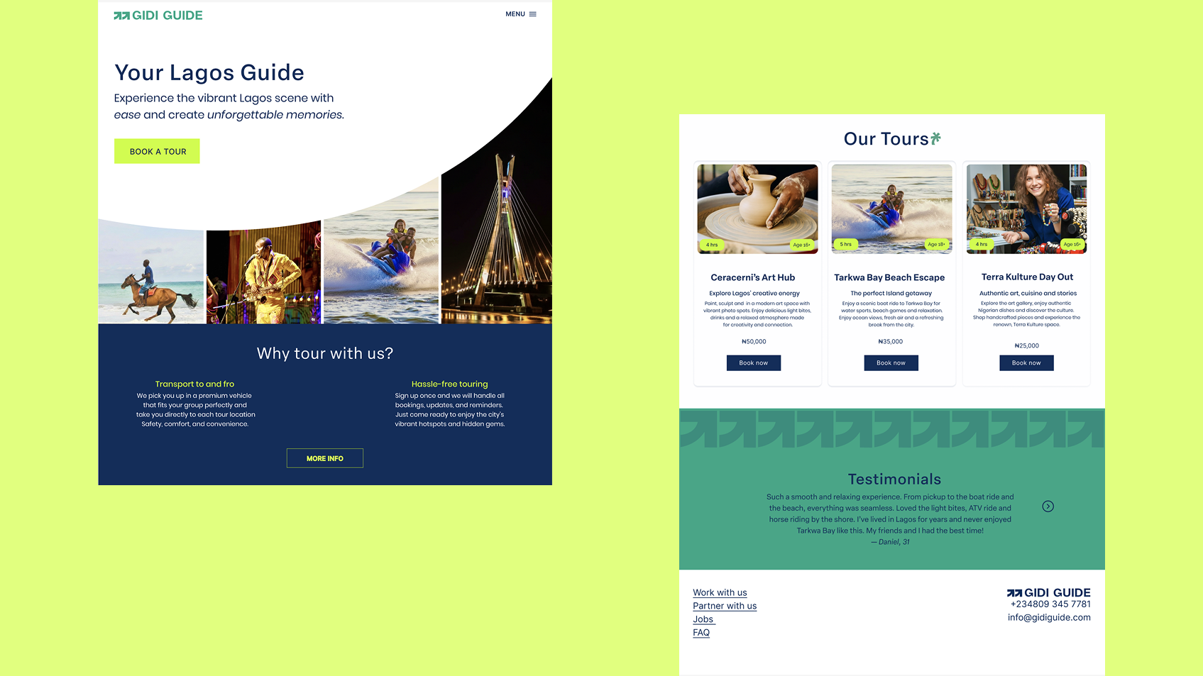 Gidi Guide is a destination and tour brand for Lagos, Nigeria, created for young professionals, residents, returnees, and tourists seeking curated weekend leisure experiences. The name is derived from Lasgidi, a popular local nickname for Lagos. The brand identity is contemporary, vibrant, and youthful, echoing the energy, creativity, and fast-paced rhythm of the city while resonating with the target audience.